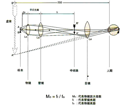 标本(AB)在物镜(Lo)焦点上,通过物镜(Lo)和管镜(Le)在象方形成放大倒立的实象(A’B’);靠近人眼一方的目镜(Le)对中间象(A’B’)再次放大,在明视距离(对人眼来说约为250mm)处形成一个虚象(A”B”)。