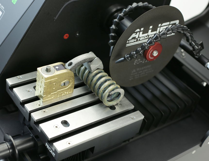 圆形或厚样品切割困难时,可选择#5-5745旋转切割附件 | 具有软启动和闭环位置反馈的自动 Y 轴样品推进 | |