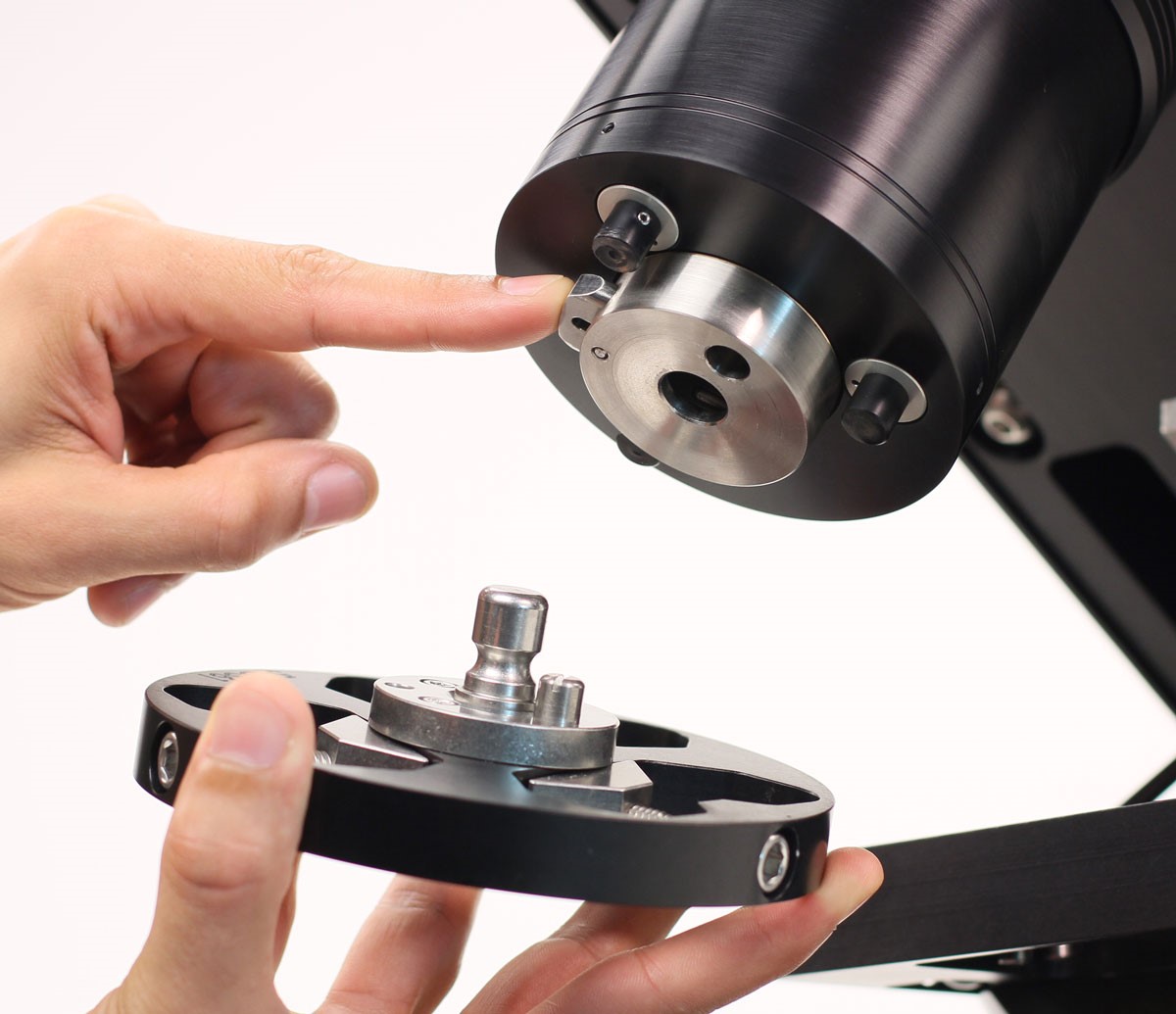 泪珠状样品架对于样品的不同形状和尺寸能够更灵活进行夹持,由定位螺丝固定每个样品;双腔样品架有一个收紧点,用于在每个腔体中快速插入和移除顶多两个圆形或不规则形试样;