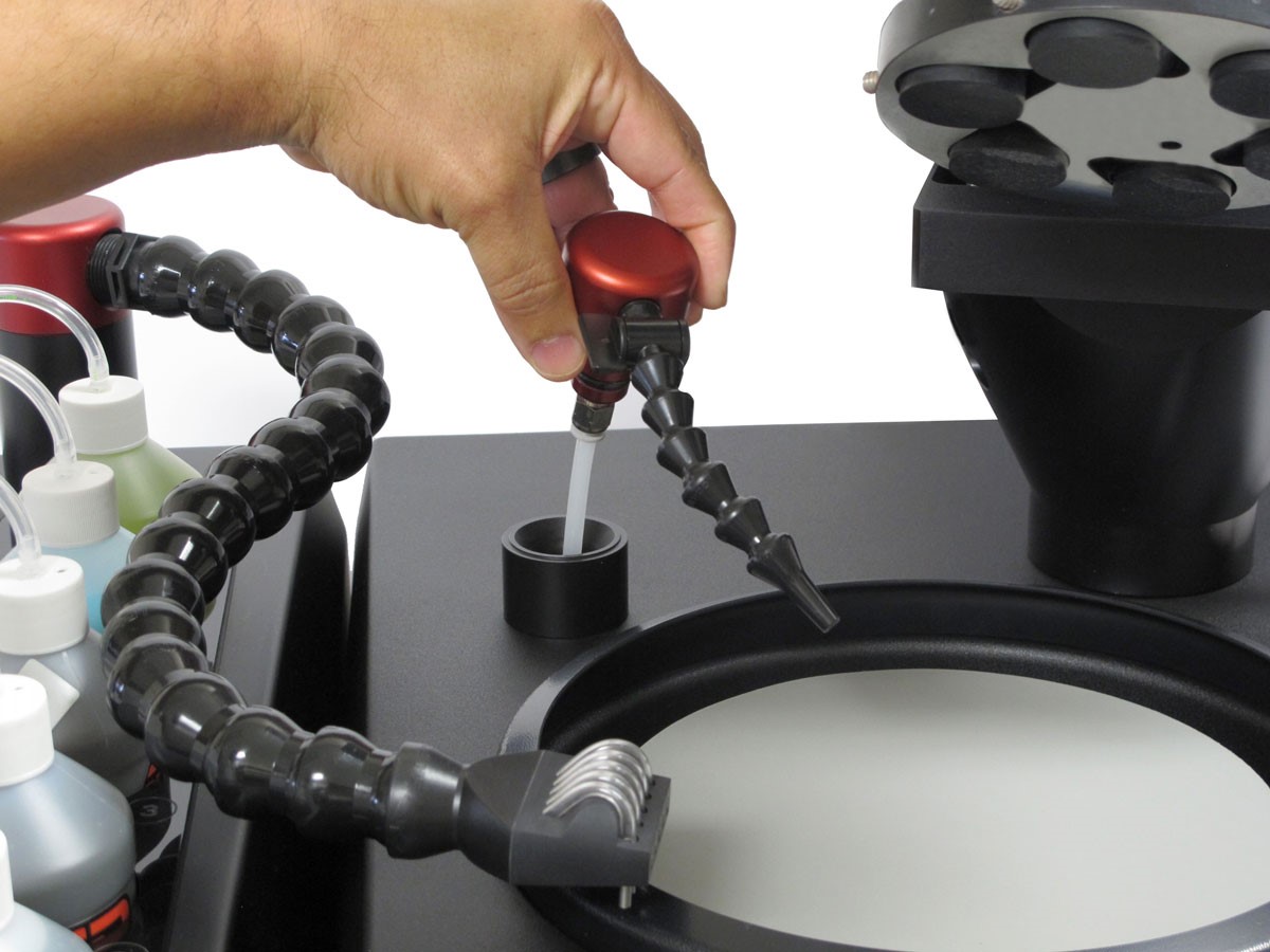 可选设备AD-5的自动液体配送功能 快速锁定系统允许样品架定位在整个研磨盘表面上